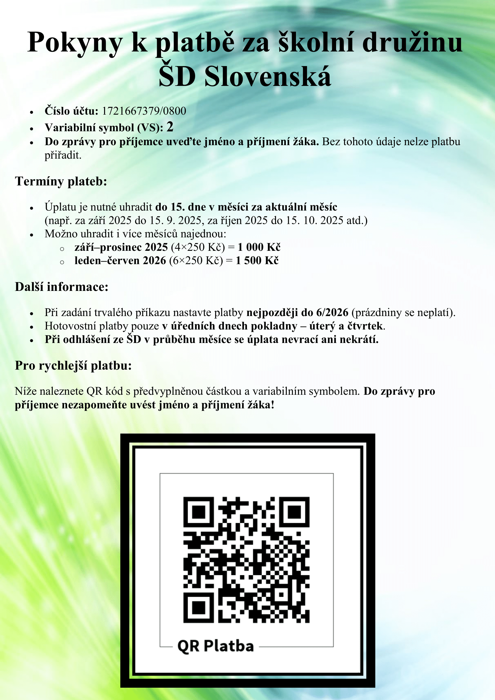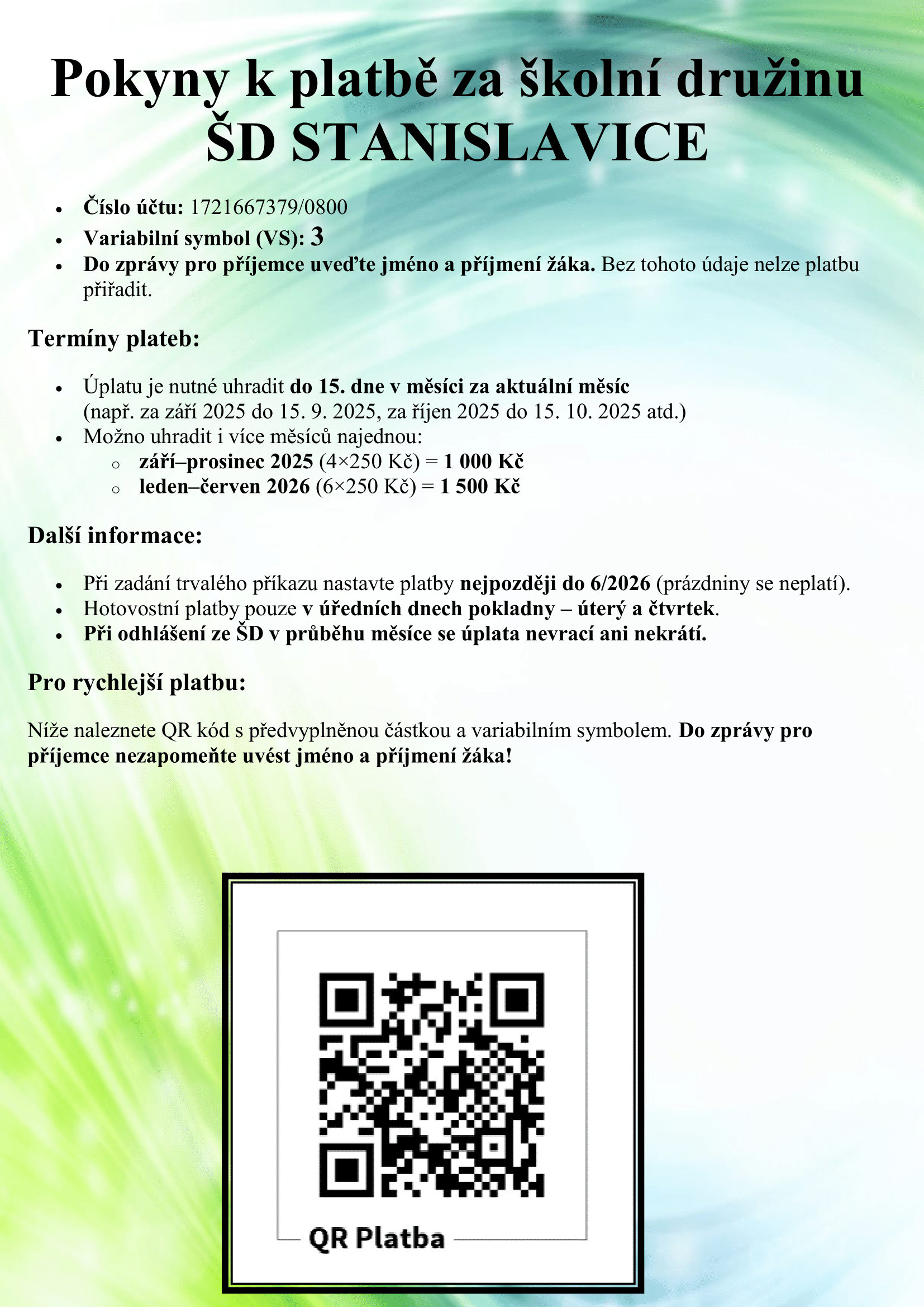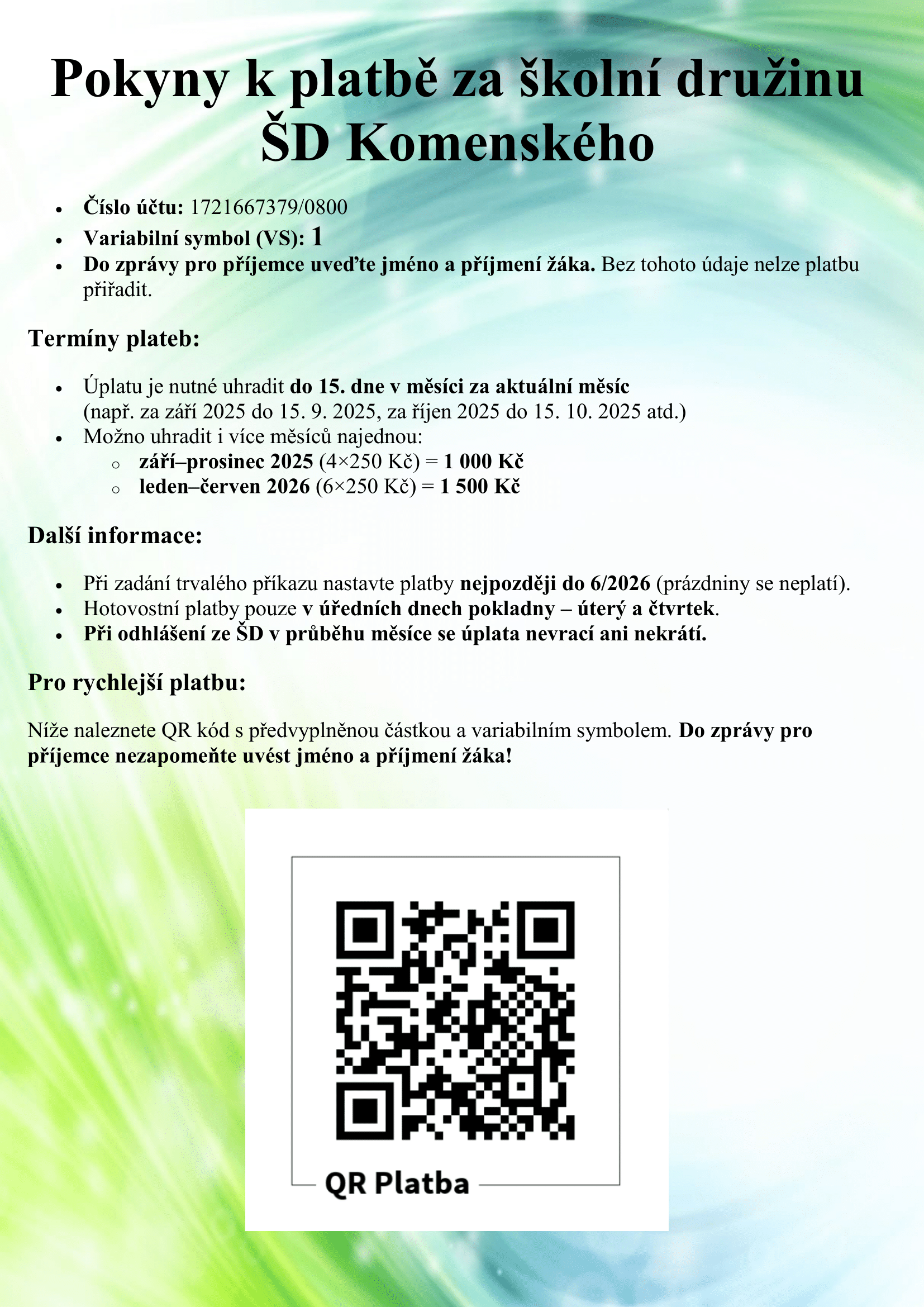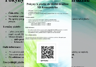 Pokyny k platbě za školní družinu
